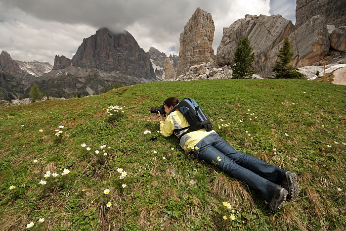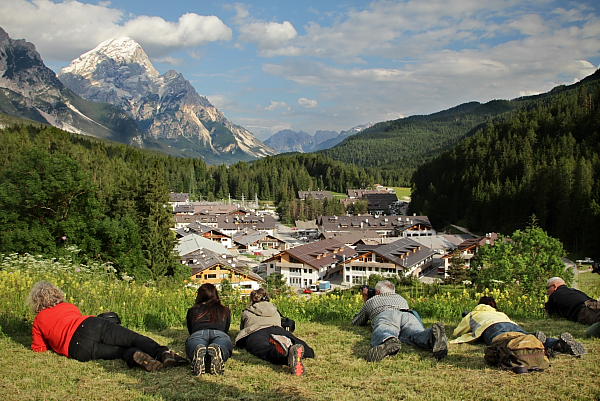 Wracając do naszej bazy zauważyliśmy piękną górę Antelao na tle pocztówkowego nieba. Jako że Uczestnicy naszych fotowypraw to prawdziwi artyści, większość postanowiła znaleźć bardziej ambitny kadr, np. góra przez kwiatki…