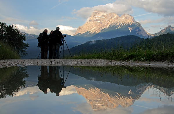 Następnego dnia dojechaliśmy do naszej miejscowości docelowej w Dolomitach i rano poszliśmy fotografować góry o świcie. W komponowaniu kadru pomagały podeszczowe kałuże: