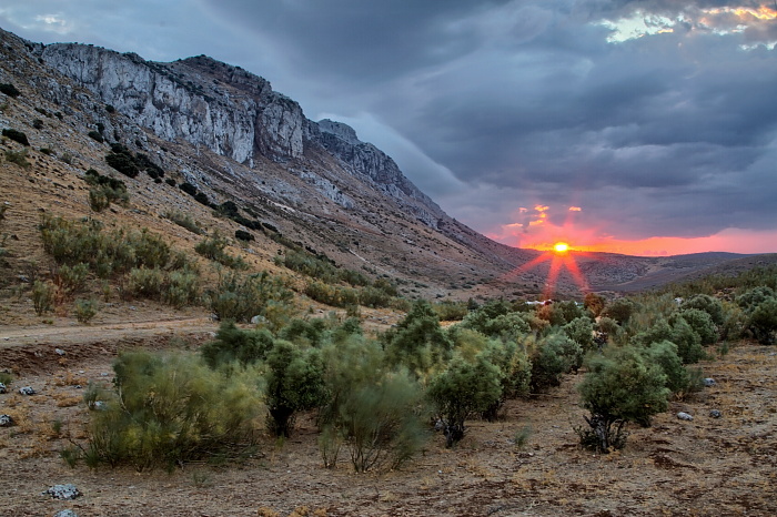Powyższe zdjęcie to pamiątka po jednym z andaluzyjskich wieczorów. Wybrałem się do skalnego miasta robić zdjęcia w popołudniowym świetle. Wyszło trochę inaczej niż planowałem, ale też ciekawie: cały masyw spowity był gęstą mgłą. Za to kiedy wracałem, za oknem samochodu objawił mi się przyjemny widok: z lewej skała, na dole bujające się na wietrze drzewka, a nad nimi zachodzące słońce. Ciach po hamulcach, bieg ze statywem i pstryk – zdążyłem w ostatniej chwili. Czasami tak jest, że człowiek coś planuje, a wychodzi coś zupełnie innego…