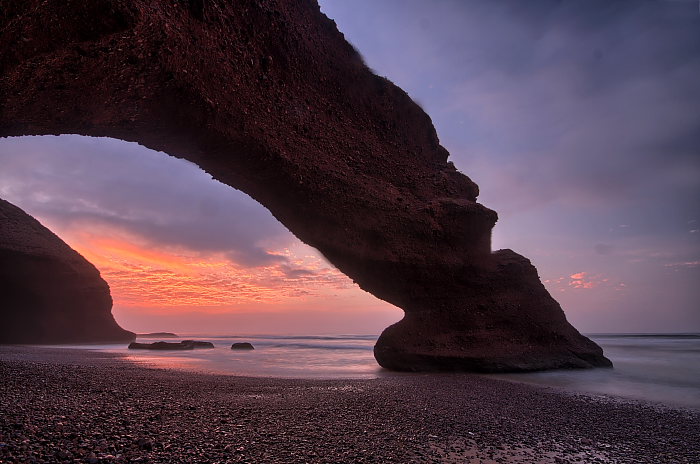 Zdjęcie powyżej zostało wykonane dokładnie przed rokiem. Przedstawia Legzirę, najbardziej niezwykłą plażę w Maroku, ze skalnym łukiem wyglądającym jak noga słonia, który postanowił wytaplać się w Atlantyku. Miejsce nie ustępuje w niczym słynnym nadmorskim plenerom fotograficznym w Europie, czy Ameryce. Większość z nich zdecydowanie przewyższa, a jednak byliśmy tu zupełnie sami – to jeden z wielkich plusów podróżowania z dala od utartych szlaków.